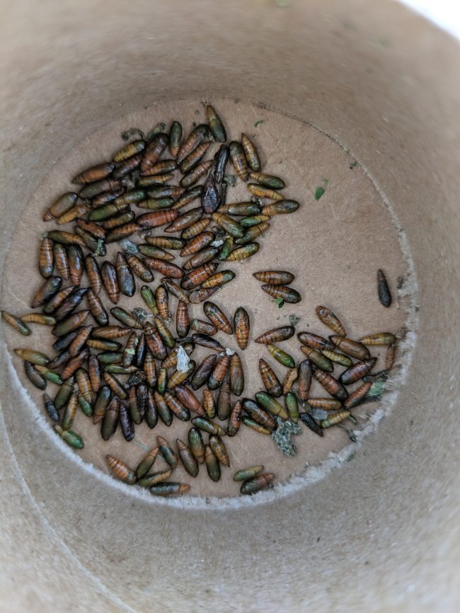 Mature larvae are small, green caterpillars with three dark stripes running the length of the body.